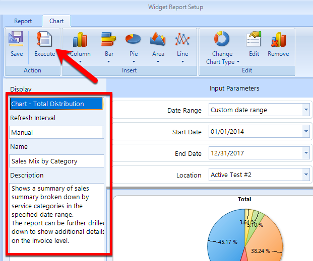 Click the Execute button in the ribbon and review the chart or report listing. When you happy with the results of your widget, set the Name and Description click the Save button in the ribbon to return to the dashboard and see the new widget there.